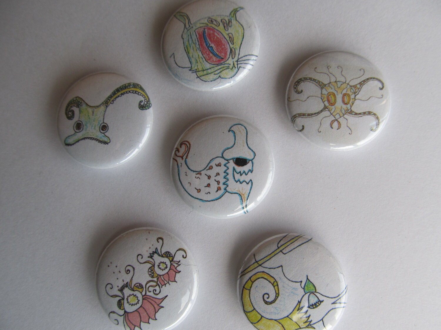 The Sea Monsters of the River Shannon - Six Original Illustrated Monster Buttons -One Inch Pinback Button Set